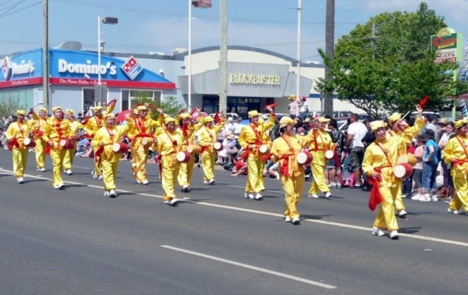 今年是法轮功学员应邀参加花节大游行的第十一个年头。天国乐团、炼功队、文艺表演队和腰鼓队四个方阵,受到观众的热烈欢迎,掌声、喝彩声此起彼伏。