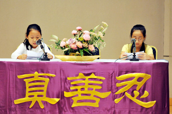 明慧学校的小弟子集体背诵了《论语》。两位参与天国乐团的小弟子分享了她们与其他大法弟子一道刻苦训练和出国洪法的故事。