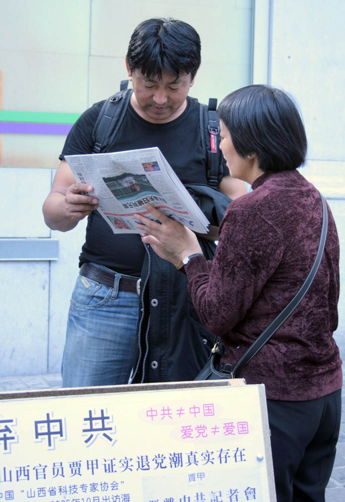 自二零零四年底《大纪元时报》发表系列社论《九评共产党》以来,彻底揭露中共邪恶本质,从而引发的全球华人“三退”大潮,退党、退团、退队已经深入中国人的民心,激励越来越多的海内外华人走出“爱党就是爱国”的误区;拒绝邪党,勇敢地汇入“三退”救国自救的历史大潮。