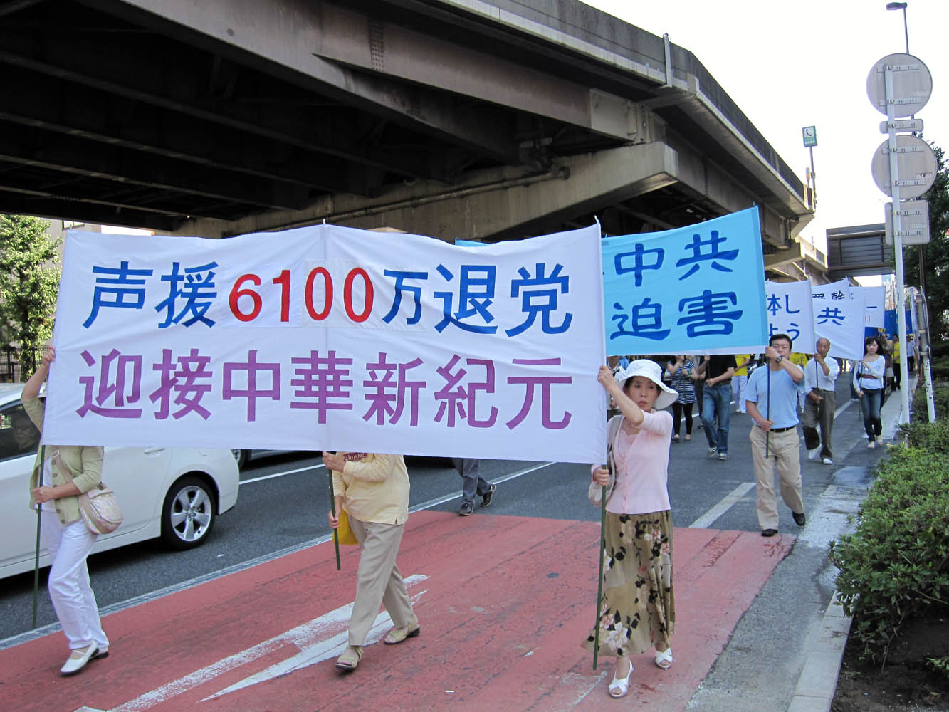 下午一点左右,游行队伍出发,参加者打出了中日文的“声援六千一百万人退出中共”、“解体中共才能停止迫害”、“天灭中共 天佑中华”等横幅。受到日本民众普遍欢迎的天国乐团也作为先导出场。