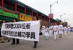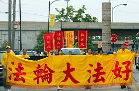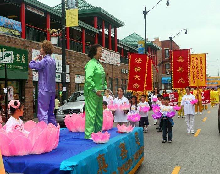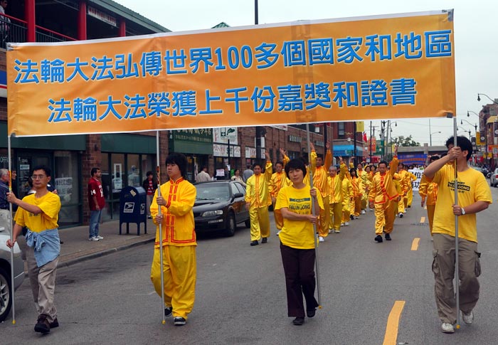 长期以来,芝加哥学员持续地在利用周末的时候在中国城炼功、讲真相、劝三退(退出中共党、团、队)。随着中国城里明白真相的人越来越多,华人的态度也在悄悄地变化:游行过程里,有的华裔家长指着横幅在教孩子读念,并欣然接受了真相资料;有的微笑友好地冲学员挥手,有的告诉同伴:“我在看法轮大法的队伍呢!”更多的华人举起相机,留下这个美好的场面。