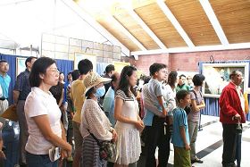 ![]() 参观美展的民众聆听导览解说画作 |