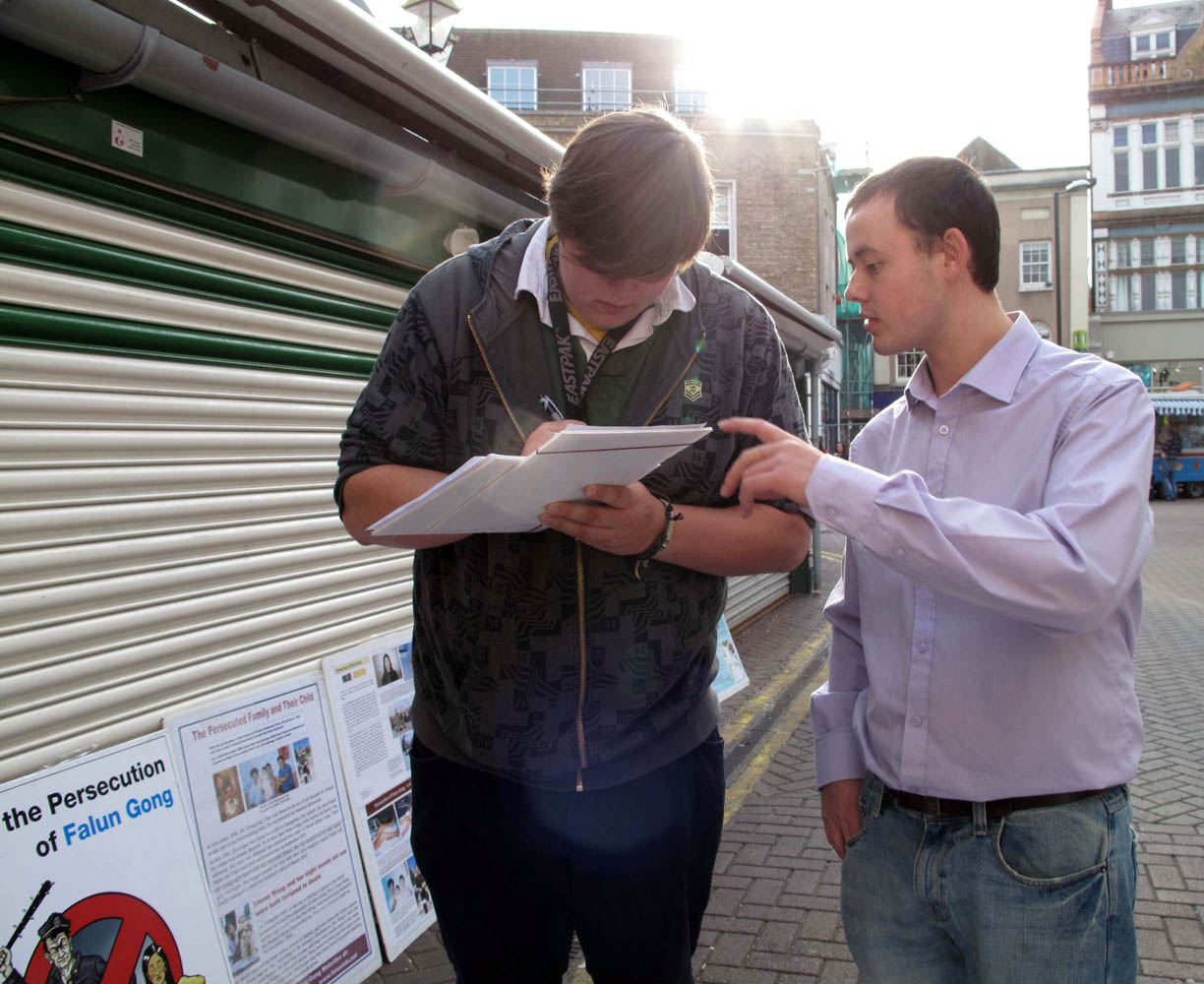 学员们注意到有一些人在真相信息台附近停留良久,或者走了又来,就是为了有机会多了解一些法轮功真相。一位中年英国男士在反迫害征签表上签字后离开,过了一会儿又来了,眼睛在桌子上的真相资料间仔细搜寻。这时一位学员递给他一个英文《九评共产党》真相光盘,告诉他看了这个能明白中共邪党为什么迫害法轮功,又给他找了一份讲真相的英文专刊报纸,接过这些真相资料后,这位英国人满意地离开了。