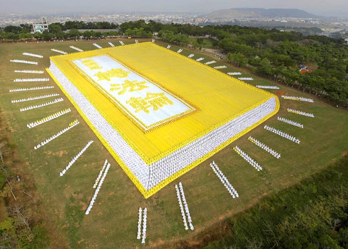 ![]() 二零零九年十一月二十一日,在台湾,六千名法轮功学员将指导修炼的《转法轮》排成金光灿烂的立体书。 |
