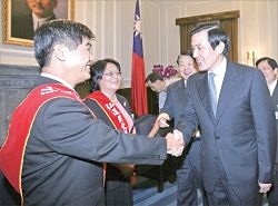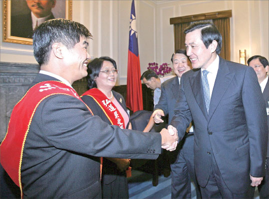 ![]() 台湾总统马英九(右)在总统府接见十大杰出教师“弘道奖”得奖人,法轮功学员宜兰县慧灯中学校长洪腾祥(左)获此殊荣 |