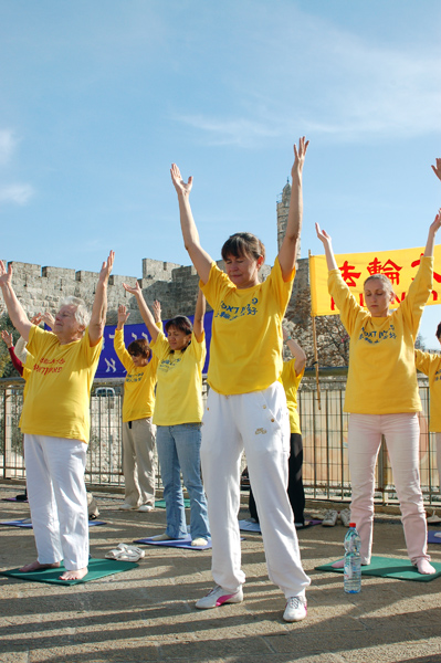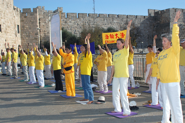 法会开始前,学员们在耶路撒冷旧城的雅法门(Jaffa Gate)炼功。学员们的活动吸引了许多游客。这是讲真相的好机会。学员们向游客派发真相资料,并请他们在制止迫害的请愿信上签名。