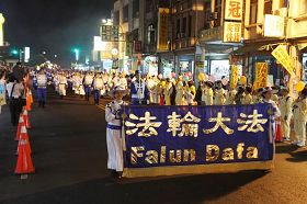 主办方在游行终点搭起了跨年晚会的舞台,天国乐团登台一连演奏了十二首乐曲,《法轮大法好》、《法鼓法号震十方》、《法正乾坤》、《送宝》、《佛恩圣乐》与《法轮圣王》等气势磅礴的乐音回荡在整个会场,更有充满节庆气氛的《欢乐颂》、《铃儿响叮当》及《普世欢腾》,嘹亮的鼓乐声响彻云霄,民众也随着欢乐的乐曲鼓掌叫好。与舞台上的天国乐团互相辉映的是当地学员在台下撑起的横幅“法轮大法好”,希望借此传达法轮大法美好的讯息给屏东民众。