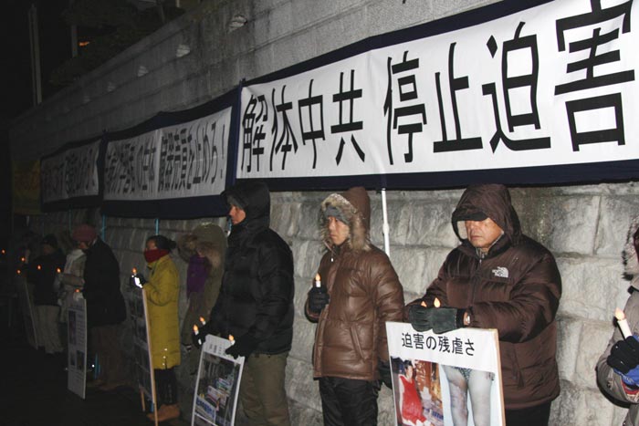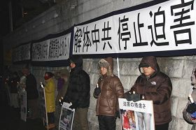 二零零九年十二月三十一日晚,日本中部地区法轮功学员冒着大雪来到名古屋中领馆前。学员们打出了写有“法轮大法好”、“真善忍”以及揭露中共在大陆疯狂迫害法轮功学员的英文条幅,希望早日制止中共对信仰“真善忍”的法轮功修炼者的迫害。