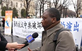 【明慧网二零一零年一月三十一日】(明慧记者报道)二零一零年一月二十九日中午,在中共驻法大使馆附近的巴黎阿斯特里德王后广场上,神韵在法国的主办单位之一亚洲之光协会成员,冒着濛濛细雨,向公众揭示中共在世界各地针对神韵演出所做的干扰和破坏。行人在了解情况之后,有的谴责中共;有的表示要去看神韵在巴黎的演出。