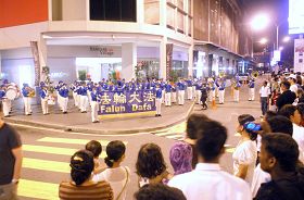 乐团成员整齐的步伐与令人愉悦的笑容,一入场立刻吸引了众多人驻足观看。乐团为现场观众演奏了《法轮大法好》、《铃儿响叮当》、《法鼓法号震十方》、《法正乾坤》、《送宝》、《欢乐颂》、《普世欢腾》等乐曲,雄壮的乐曲受到人们的热烈欢迎,民众争相拍照留念。