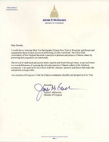 ![]() 詹姆斯•麦高文(James McGovern)的贺信 |