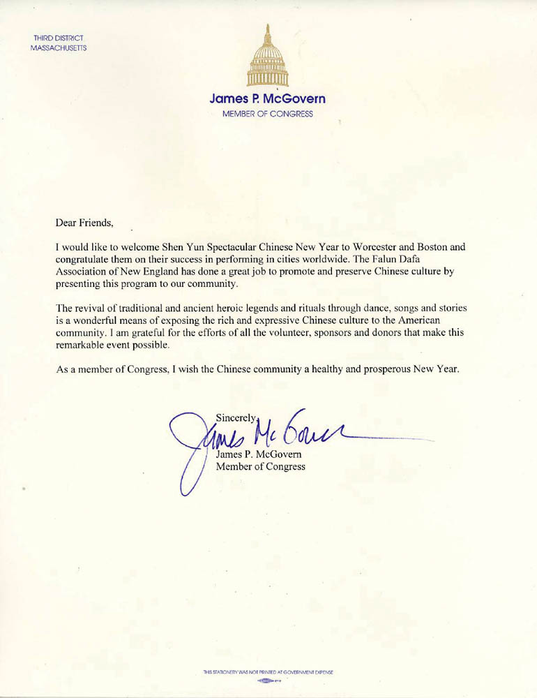 国会众议员、兰托斯人权委员会民主党共同主席詹姆斯•麦高文(James McGovern)在贺信中表示,欢迎神韵新年晚会光临渥斯特和波士顿,并恭贺他们世界巡回演出成功。同时他也赞扬新英格兰法轮大法学会主办神韵演出,为推广和保留中国文化做出贡献。