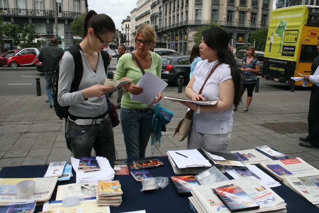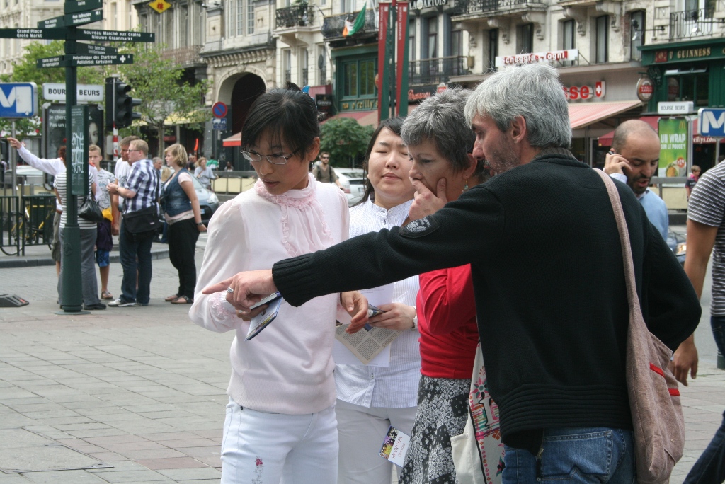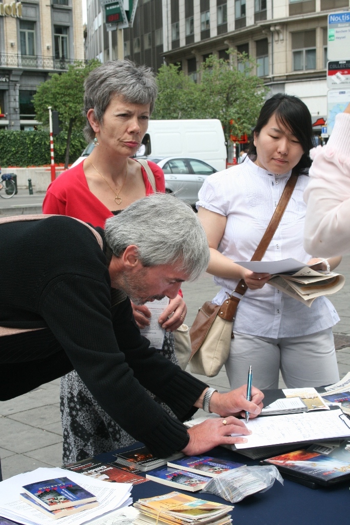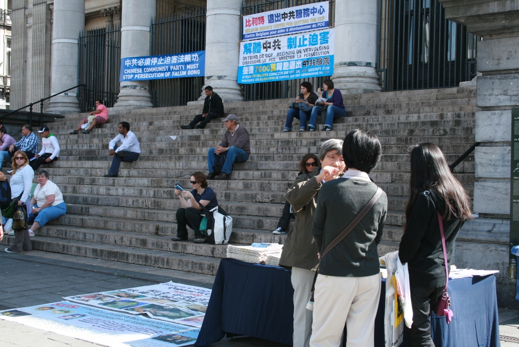 朱女士说,现在“三退”(退出中共党、团、队)的大陆游客也多了。有个青年男子,下了大巴就走到资料桌跟前,大声地对帮助他照相的同伴喊,走近点、走近点照。她接着说:现在即使一些人还有怕心,不敢带资料回国,他们还是希望把在海外看到的景象带回国给亲朋好友看,就不停地对着有“比利时退出中共服务中心,解体中共才能制止迫害,中共停止迫害法轮功”等大字横幅照相片,录制录像片。她说:法轮功学员相信善恶有报是真理,讲真相劝三退为的是使被蒙蔽的中国人摆脱在加入其组织时要为其“献出自己的生命”那个邪恶的誓言捆绑,邪恶的中共遭报应的时候,免除一起遭恶报的牵连。