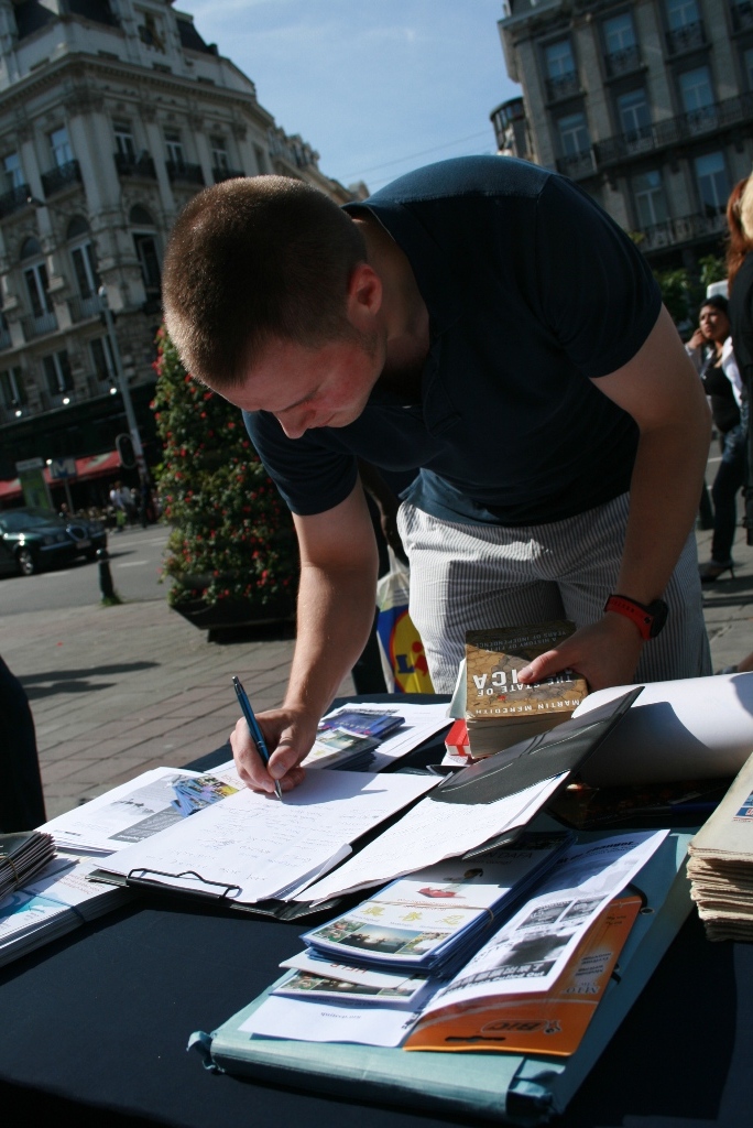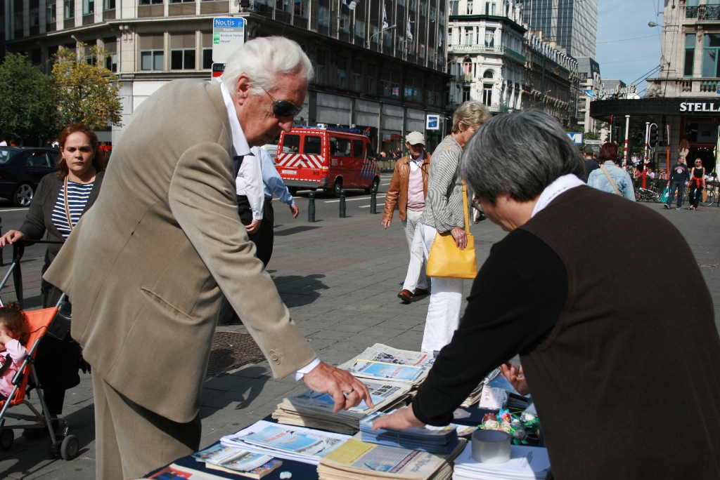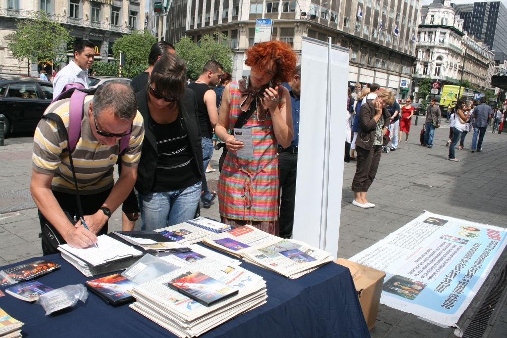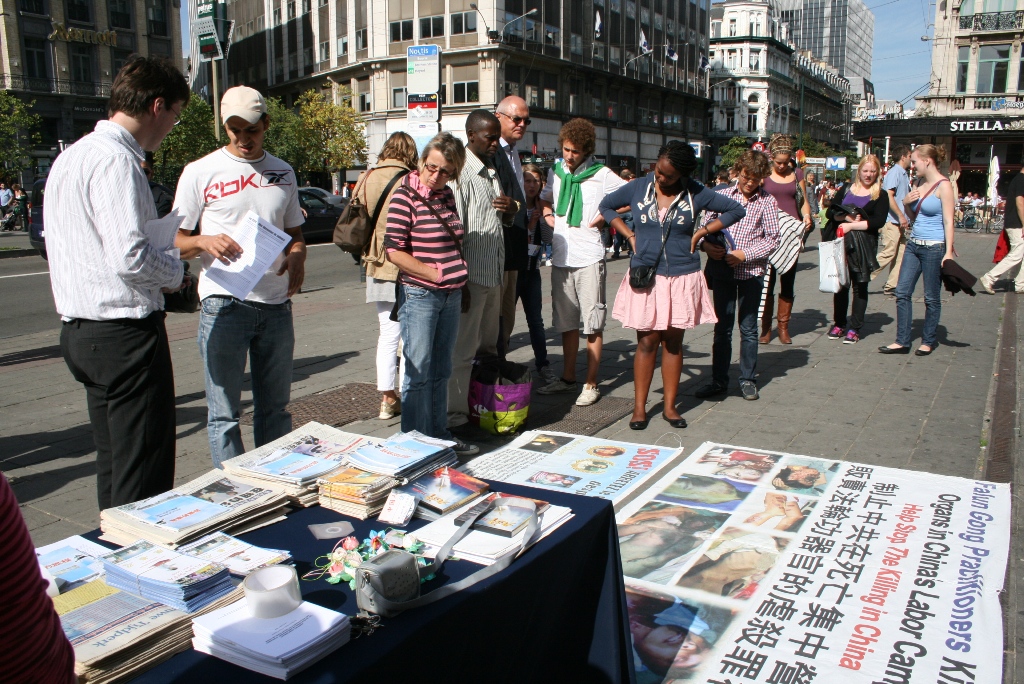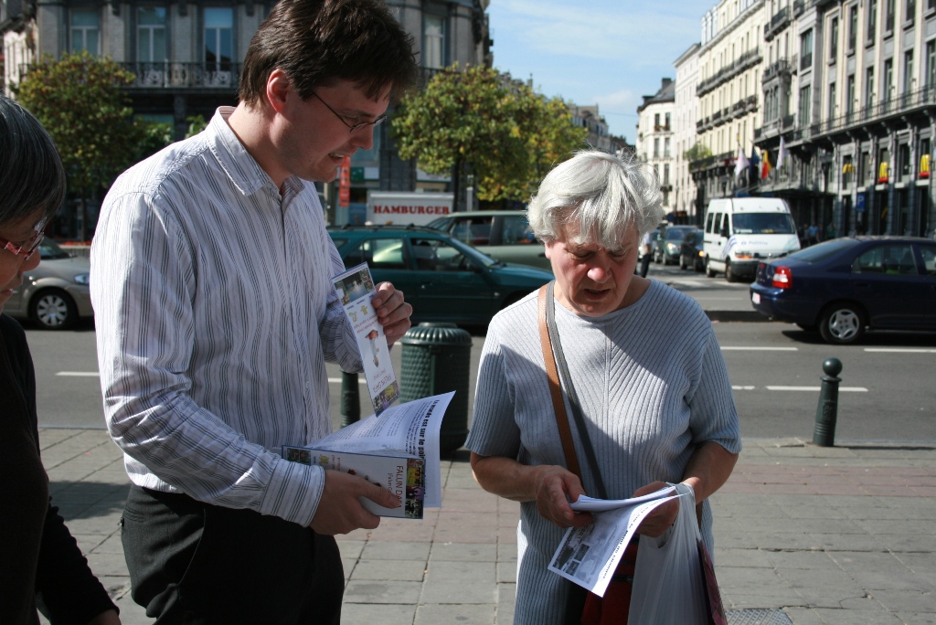 朱女士说,现在“三退”(退出中共党、团、队)的大陆游客也多了。有个青年男子,下了大巴就走到资料桌跟前,大声地对帮助他照相的同伴喊,走近点、走近点照。她接着说:现在即使一些人还有怕心,不敢带资料回国,他们还是希望把在海外看到的景象带回国给亲朋好友看,就不停地对着有“比利时退出中共服务中心,解体中共才能制止迫害,中共停止迫害法轮功”等大字横幅照相片,录制录像片。她说:法轮功学员相信善恶有报是真理,讲真相劝三退为的是使被蒙蔽的中国人摆脱在加入其组织时要为其“献出自己的生命”那个邪恶的誓言捆绑,邪恶的中共遭报应的时候,免除一起遭恶报的牵连。