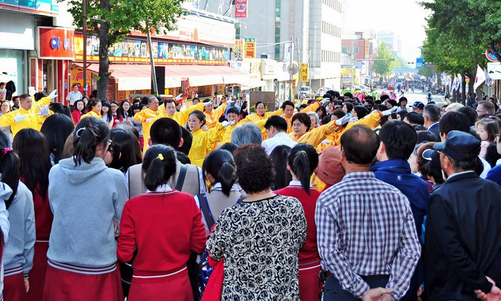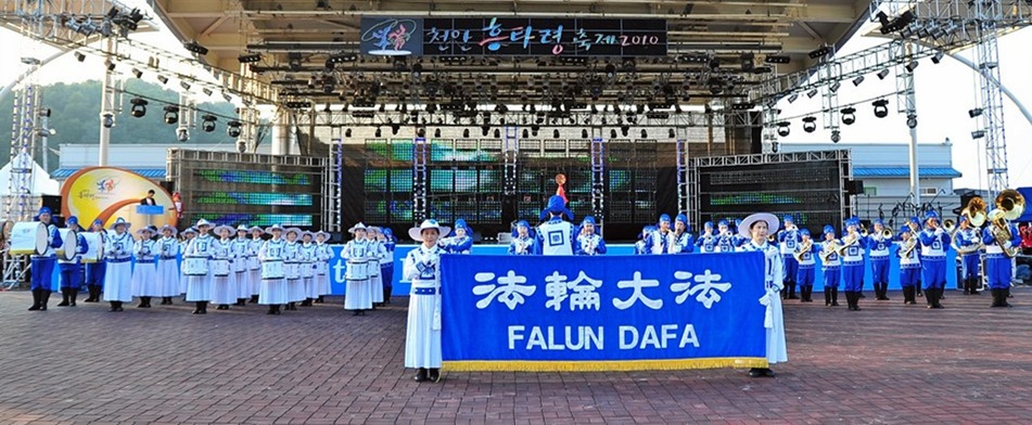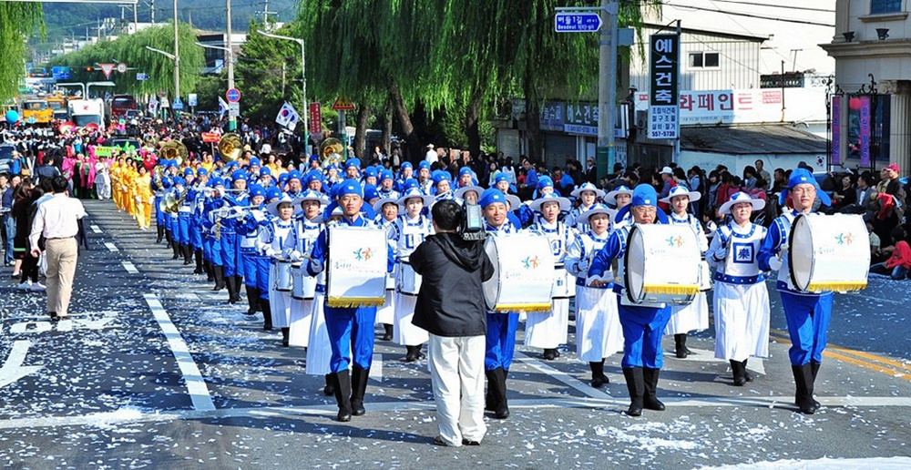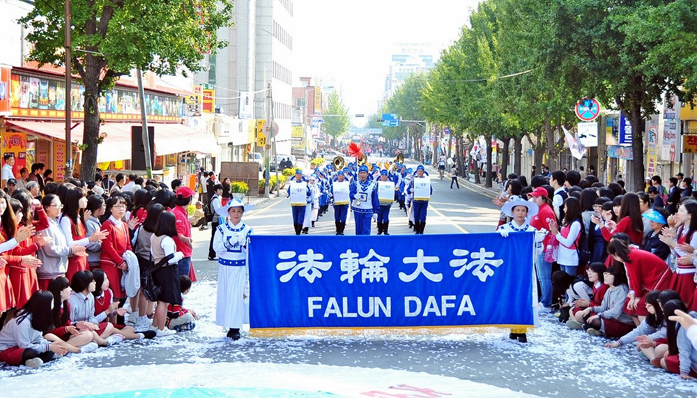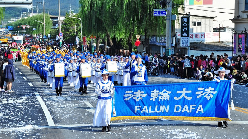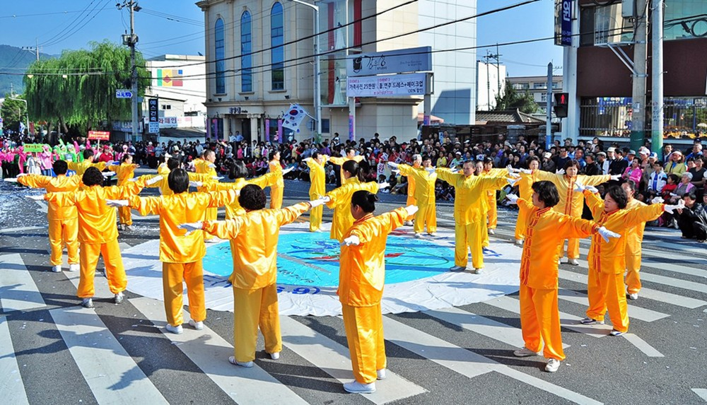 韩国法轮功学员组成的天国乐团应邀参加了十月六日和闭幕式两天的游行庆典。部份法轮功学员身着金黄色炼功服,紧随天国乐团,向沿途观众演示功法。主办单位在沿途解说中向观众循环介绍:法轮功是以“真、善、忍”为原则的性命双修功法,法轮功学员包括社会各个阶层和不同年龄。
