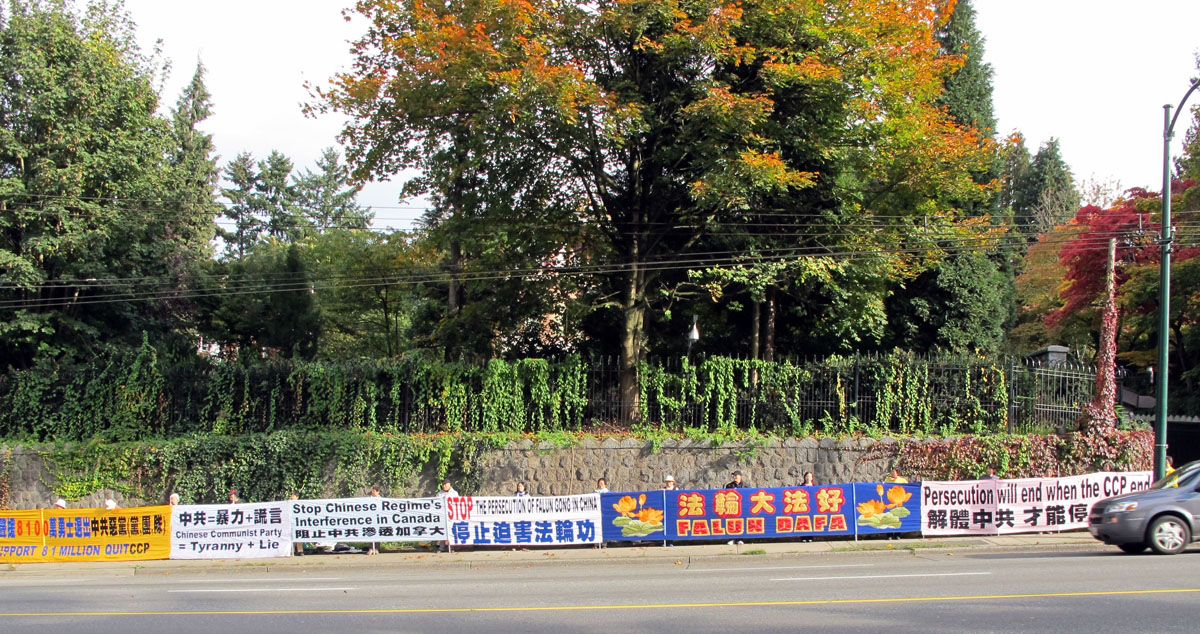【明慧网二零一零年十月二十六日】(明慧记者王枚温哥华报导)二零一零年十月二十三日,温哥华法轮功学员迎来了在中领馆前抗议案胜诉后的第一个周末。中午起,许多法轮功学员来到中领馆前,拉起了近百米长的横幅,“法轮大法好”、“世界需要真、善、忍”、“停止迫害法轮功”、“解体中共才能停止迫害”和“阻止中共渗透加拿大”等巨幅标语。