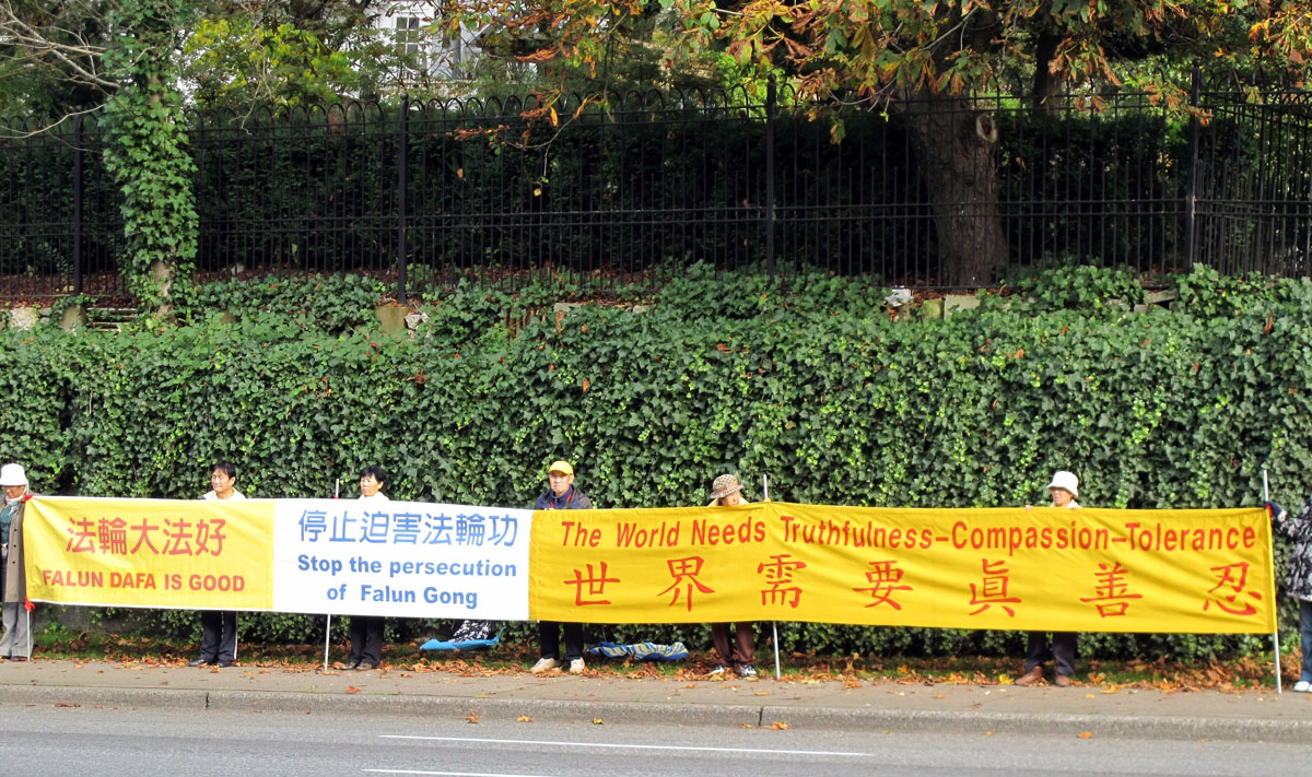 温哥华法轮功学员在中领馆前打横幅