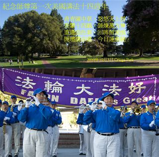 美西天国乐团也参加了当天的庆祝活动,并演奏了《法轮大法好》等乐曲,大法弟子赋诗一首,纪念师尊第一次美国讲法十四周年: