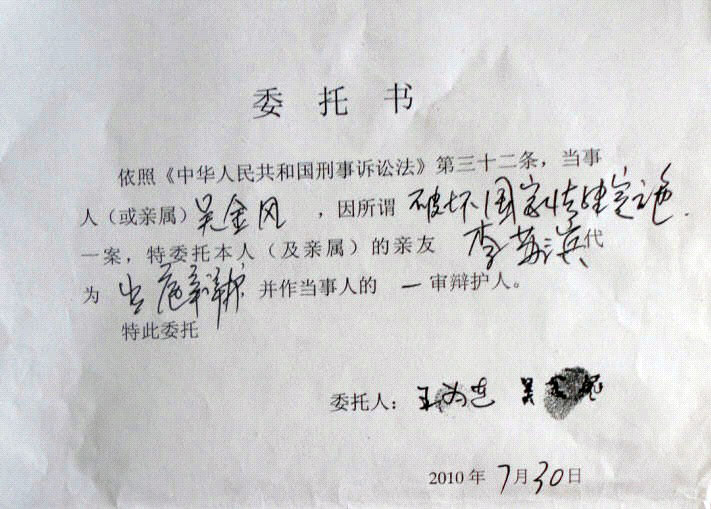 吴金凤的家人原本请了一名当地律师纪涛。可是纪涛与“六一零”恶人勾结,反而成了迫害吴金凤的帮凶,竟在非法的“逮捕证”上代替吴金凤签字,在吴金凤被迫害的命危之时,仍不告知其家人。失望之下,家人辞退了纪涛,重新聘请了两名北京的著名维权律师,准备在法庭上为吴金凤做无罪辩护。