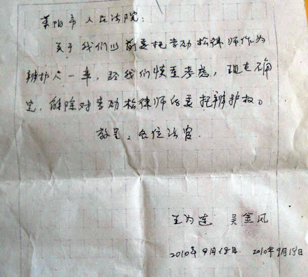 这一天,原定于二零一零年九月十九日上午八点半开庭,在开庭前一小时,法官突然拿出了吴金凤夫妇双双签名的解除律师委托书(签名字迹与吴金凤不符,疑似伪造),称家属已辞退律师。北京律师要求见当事人证实这个事实,遭法官拒绝。北京律师最终未能入场辩护。更荒谬的是,家属“辞退”了欲为吴金凤做无罪辩护的北京律师,聘请了一名当地律师朱向丽为吴做了有罪轻判的辩护。
