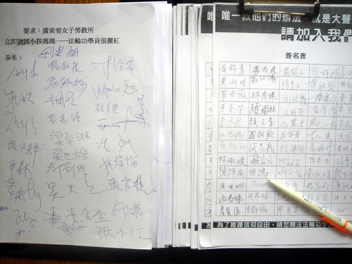 在几次的签名活动中,已有接近二千名香港各界人士签名要求中共立即释放张丽红。