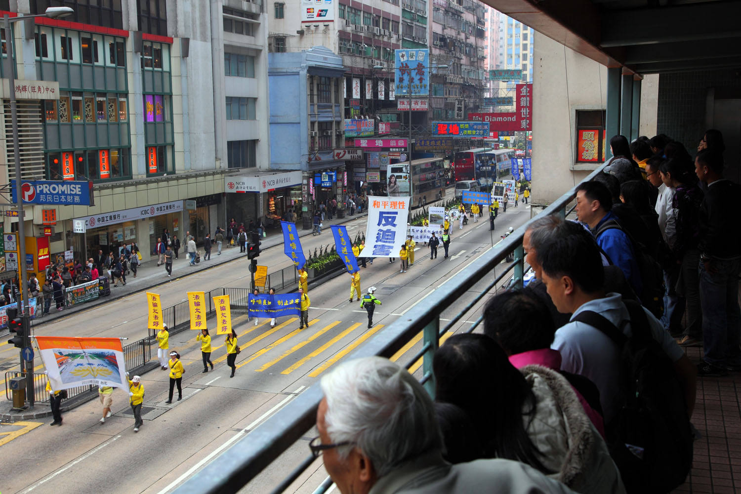 ![]() 游行队伍走在弥敦道上,人行天桥上的民众也驻足观看。 |