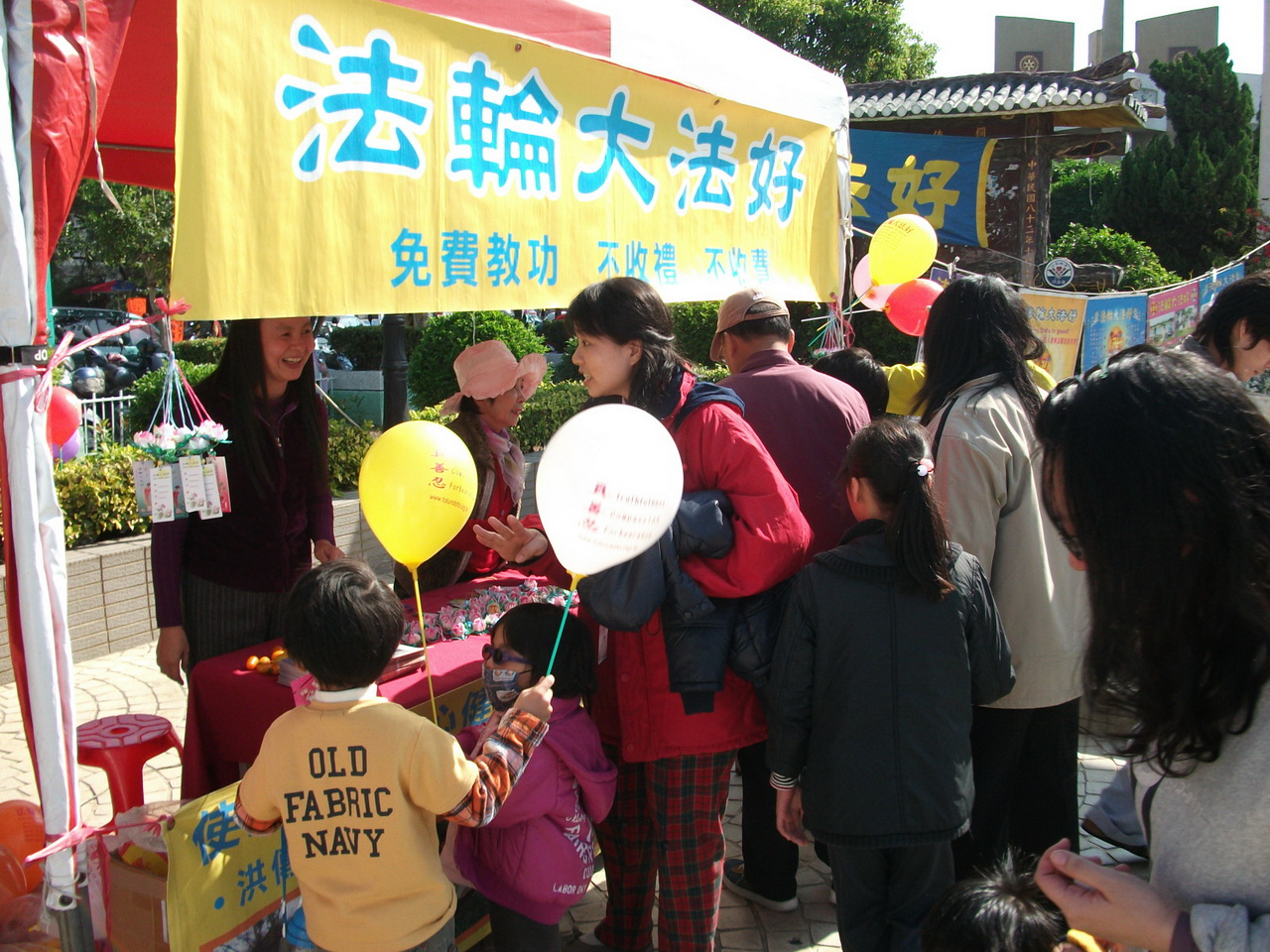 介绍法轮功的摊位上,不时有民众前来了解询问,拿取简介资料