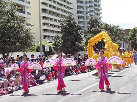 当法轮大法的游行队伍出现时,人群不断传出赞叹声,在长达两公里的路线上,不断可以从人群中传出“法轮大法好!”的欢呼声。身着秀美服装的仙女队,手拿印有“真善忍”的扇子婷婷而至;法轮功学员组成的舞龙队和整齐的腰鼓队也吸引了观众的目光,赢得了不少喝彩。