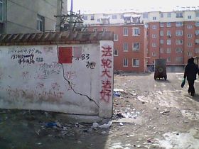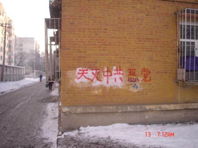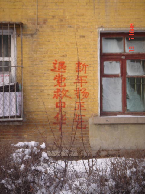 在中华民族传统的新年佳节(大年三十),中国大陆北方某大城市出现大量法轮功(又称法轮大法)及退党真相标语。