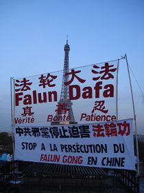 自二零零五年以来,为揭露中共邪恶本质、制止其迫害法轮功,一些法国法轮功学员经由合法申请手续,经常在埃菲尔铁塔附近设立展板,播放录音,散发《九评共产党》,揭露中共迫害百姓的事实,劝说每天众多的中国游客退出中共、共青团和少先队(三退),据粗略估计,至今已有近万中国人在此“三退”。