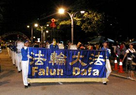 周六(二十日)晚上八时起,国际热气球节上空响起了嘹亮的乐音,天国乐团迈着整齐步伐走入活动现场,游行与定点演奏一个小时,给大家带来多首乐曲,其中包括《法轮大法好》、《法正乾坤》、《法鼓法号震十方》、《送宝》、《欢乐颂》、《普世欢腾》,为人们带来意外惊喜。大量民众兴致勃勃地观赏演奏,并拿起相机和手机拍摄留念。