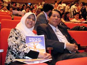 马来西亚友谊贸易中心代表(Malaysian Friendship & Trade Center President)拿督亚都拉(Dato' Abdullah Mohd Salleh)夫妇去年已经看过一次神韵演出,今年再来观赏世界第一秀。看完上半场后亚都拉表示:“演出非常有意义,服装简直美极了。她让人更认识中国传统文化,以及中国(自古以来)对于不同种族文化非常大的包容程度。马来西亚也是一个多元文化种族的国家,所以我很有感觉。”