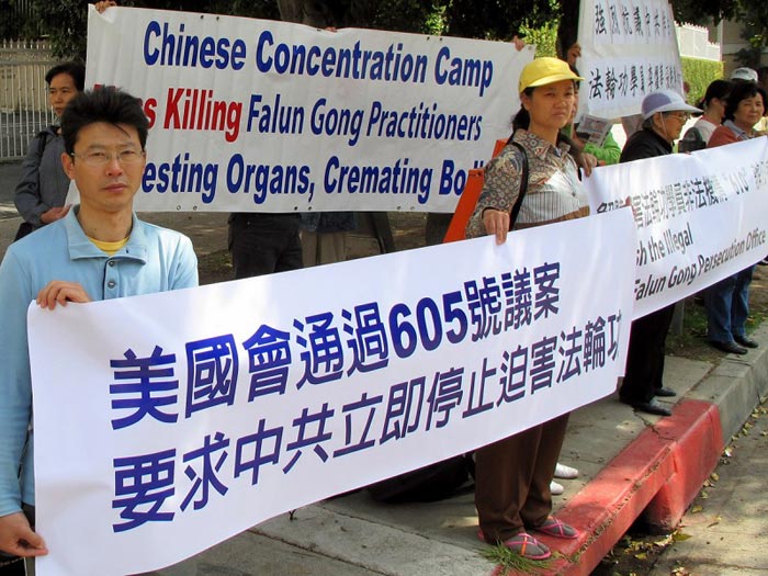 ![]() 3月25日,法轮功学员在洛杉矶中领馆前抗议中共继续迫害法轮功,并呼吁营救被非法关押的亲属。 |
