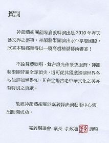 嘉义县县长张花冠在贺词中说:神采飞扬、韵音绕梁、艺冠群伦、术技精湛,欣闻神韵艺术团将于二零一零年春天莅临嘉义县表演艺术中心演出,带来深度内涵的艺术飨宴。敬祝圆满成功、佳评如潮。