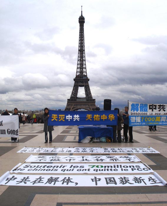 法国退党服务中心常年坚持在巴黎埃菲尔铁塔附近为大陆游客做退党服务。退党服务中心的义工成先生表示,每天都有大陆游客退党,多的时候有上百人退出。他们退党之后,都能看出他们轻松的样子,并向退党义工表示感谢。