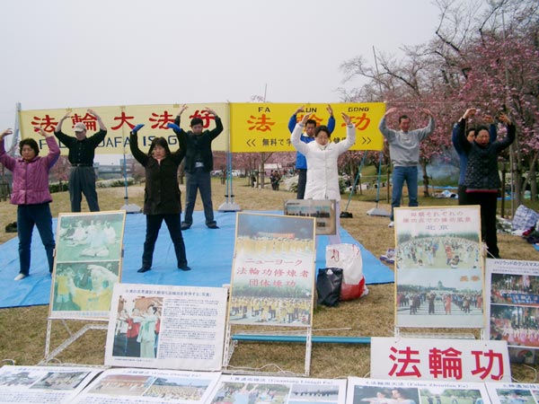 有一位住在名古屋的女士,跟着公公婆婆来到了樱花节,她婆婆家就在附近住。她在学了法轮功的第一套功法后表示感觉很好,浑身感到热呼呼的,表示今后要学炼法轮功。她说以前在网上曾看到过法轮功在中国受迫害的内容,问学员:“在日本炼法轮功,没关系吗?”当学员对她说:“在日本炼法轮功,没有关系,都是自由的。当法轮功学员有游行的活动时,日本的警察都会为我们维持秩序,保护我们的,而且还有警车开道。”她听后笑着说:“那还不错!”