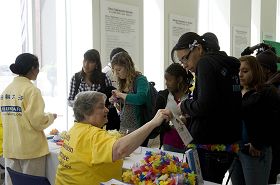 ![]() 法轮功的展位前吸引了络绎不绝的大学生观看、学习功法及折叠纸莲花。 |