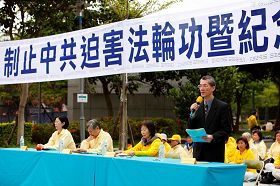 ![]() 二零一零年四月二十四日下午,台湾法轮大法学会举行「制止中共迫害法轮功暨纪念4.25十一周年」记者会 |