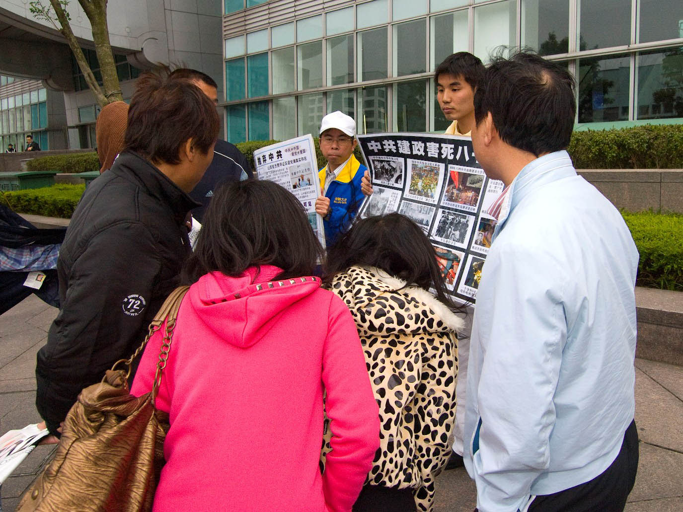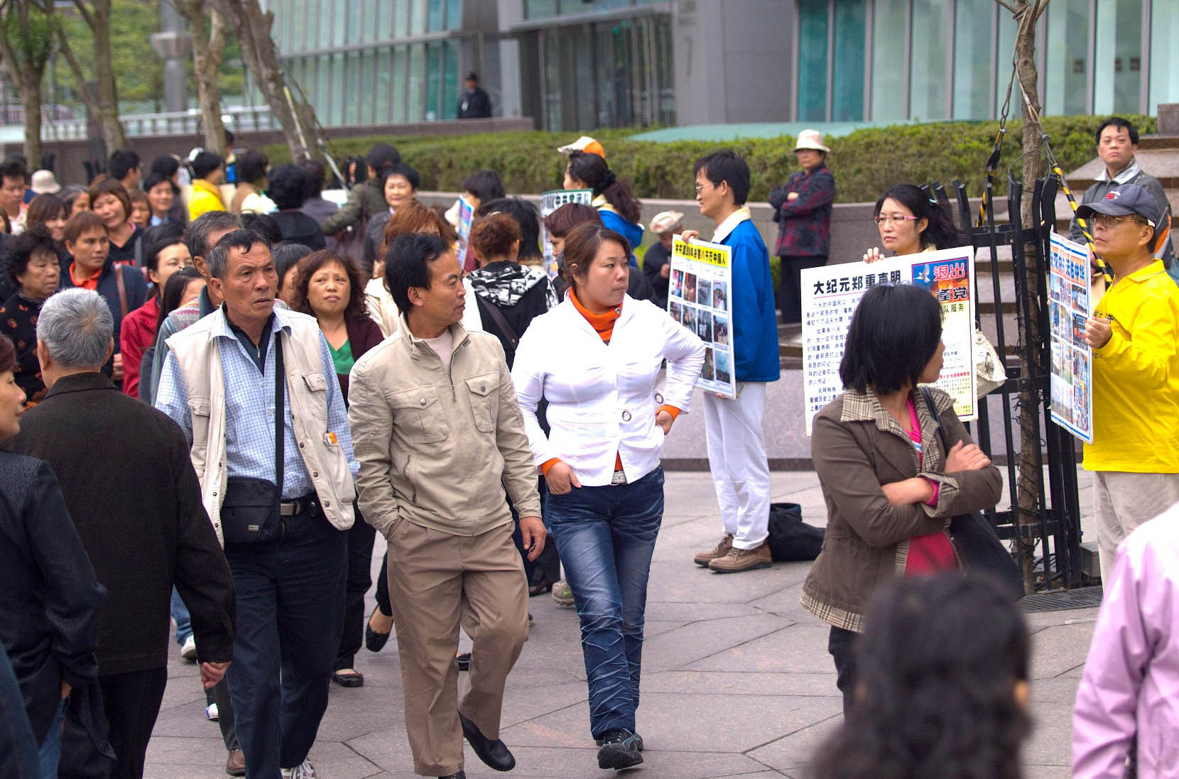 连绵不断的春雨在记者会举行前停了,空气洁净而舒爽,几百名大陆游客聚集在一零一广场,透过一条马路,清楚听到法轮功的真相。许多人在学员拿的看板前来来回回走着,许多人拿起手中的摄影器材,留下在中国难得一见的珍贵画面。而有更多的大陆游客则是静静伫立街头,从头到尾没有离去。这个记者会不仅是为了他们而来,更为了世界上许多还不了解真相的世人所举行。