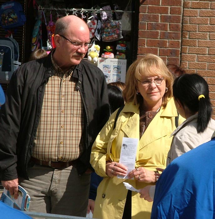 了解真相的人们一批又一批的,许多西方人是第一次听说法轮功的事情,几乎所有人都被中共的邪恶、残暴所震惊,不敢相信会有这样的事情发生。他们希望迫害早日停止。一对来自英语区的夫妇与法轮功学员交谈了大约二十多分钟,详细的了解法轮功和“四·二五”等情况,最后他们说:“我们支持你们的正义行为。”