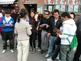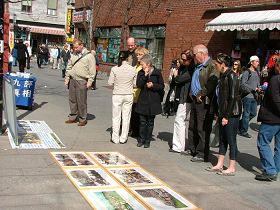 ![]() 法轮功学员们在唐人街中山公园的集会现场 |