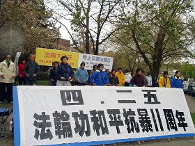 在集体炼功的同时,有许多学员分散在唐人街各个路口发资料,讲真相。不断有过往路人停下来驻足观看,有的路人表示要学功,也有人来和学员交谈,了解四‧二五真相。当年参加上访的学员回忆起十一年前的情景,更是感慨万千。