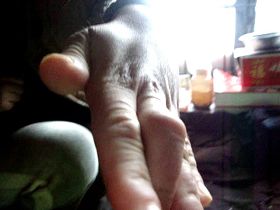 ![]() 2010年图片:被迫害致疯的柳志梅,当有人试图接近,她就攥着双手躲向自家墙角 |