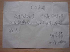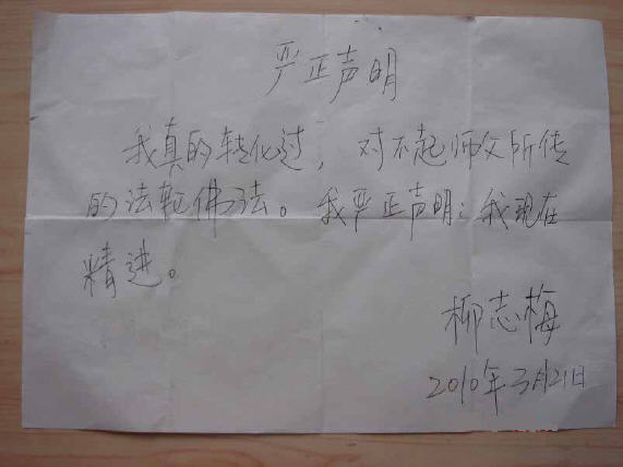 当警察突然闯入时,一瞬间,没有人说话,只见柳志梅象忽然换了一个人似的,字字清晰、极其熟练的开口说道:“警察同志,我叫柳志梅,我炼法轮功我有罪,我判了十二年,判我死刑也可以,判我死缓也可以。”象是在背课文。