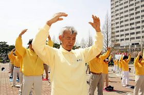 当日下午一时,一百五十多名身穿黄色T恤与米色长裤的法轮功修炼者,在花卉展示场入口开始了集体炼功演示,他们从儿童到白发苍苍的老人,包括了各个年龄层。游览湖水公园的很多观众,被这种祥和优美的集体炼功场面所吸引。
