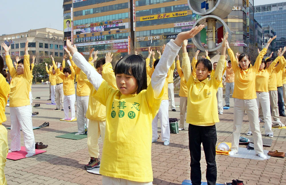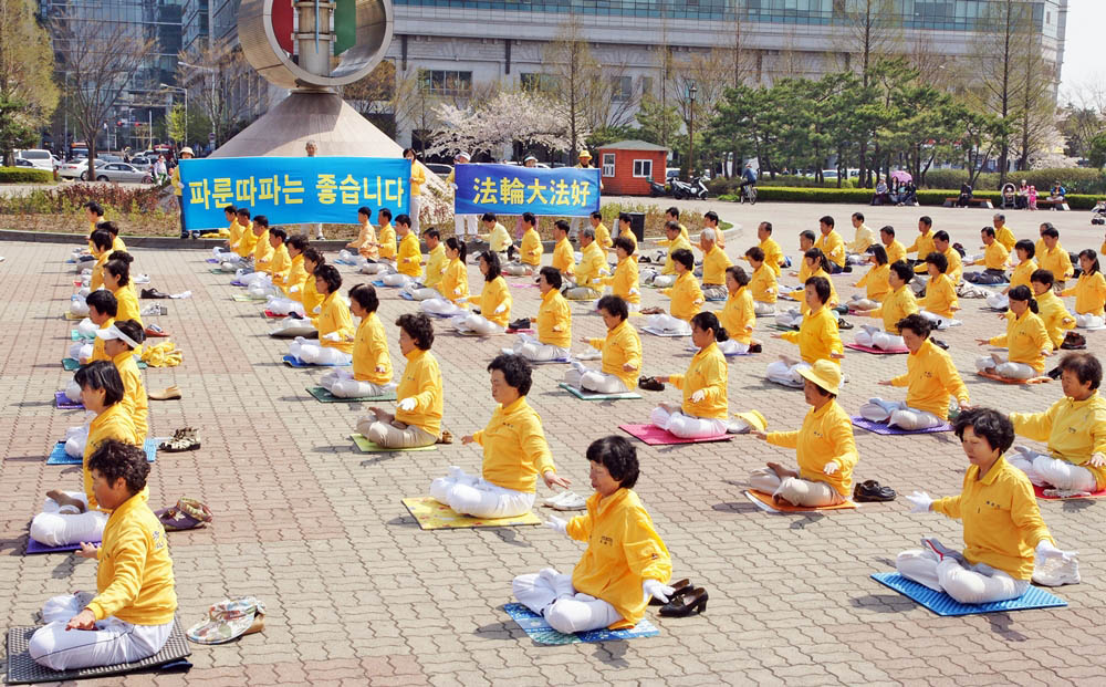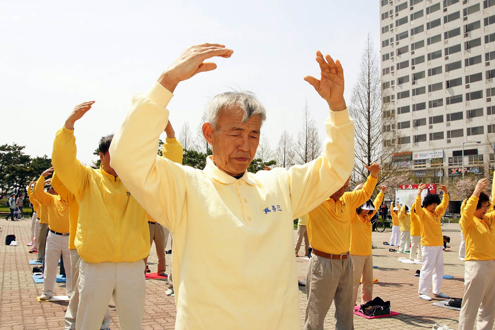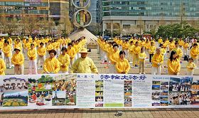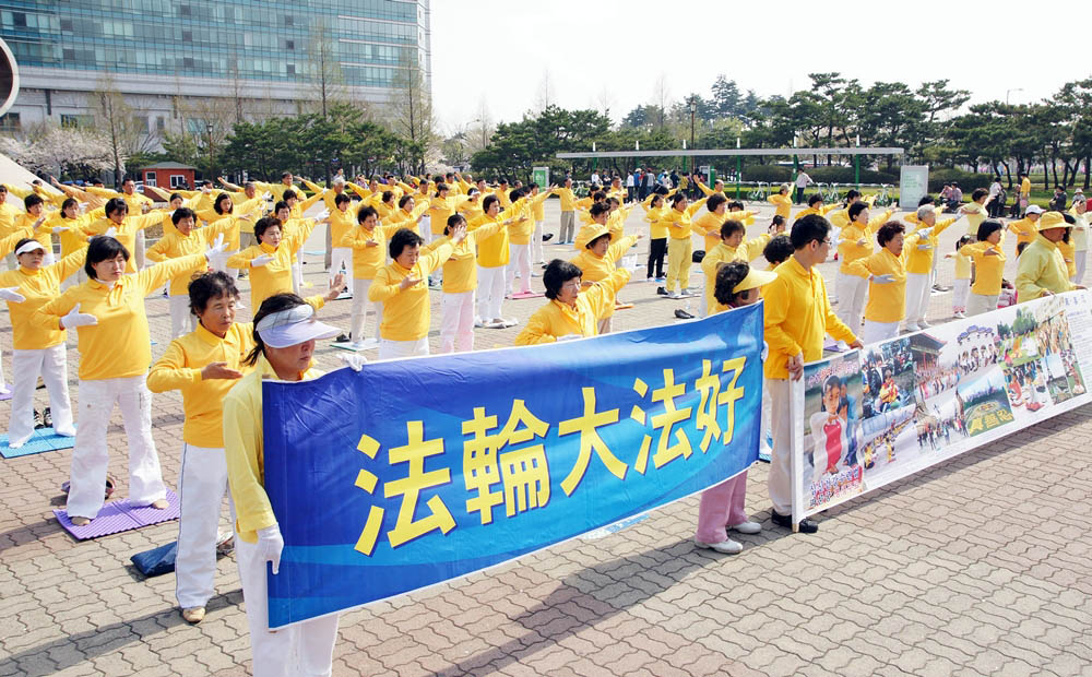 湖水公园正在举办韩国花卉博览会,且当天正逢周日,蜂拥而来的各地游客被法轮功学员的集体炼功场面吸引。