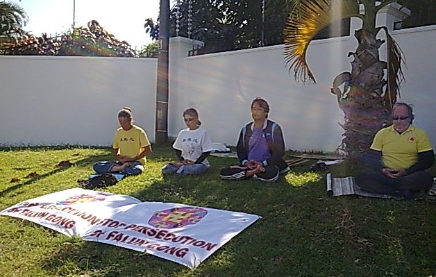 学员的抗议场面安静祥和。横幅上用英文写着:“停止迫害法轮功”。不时有开车路过的人们放慢车速,甚至停下来观看炼功情形和横幅。