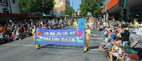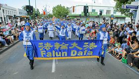 游行历程五公里,沿路的人们不停地为法轮大法鼓掌,不时听到有人在说“法轮大法,太棒了!”就连维持秩序的活动组织者们也不失时机地向法轮功学员们竖起拇指:“太优美了!”更多的人则主动了解法轮大法的资讯。