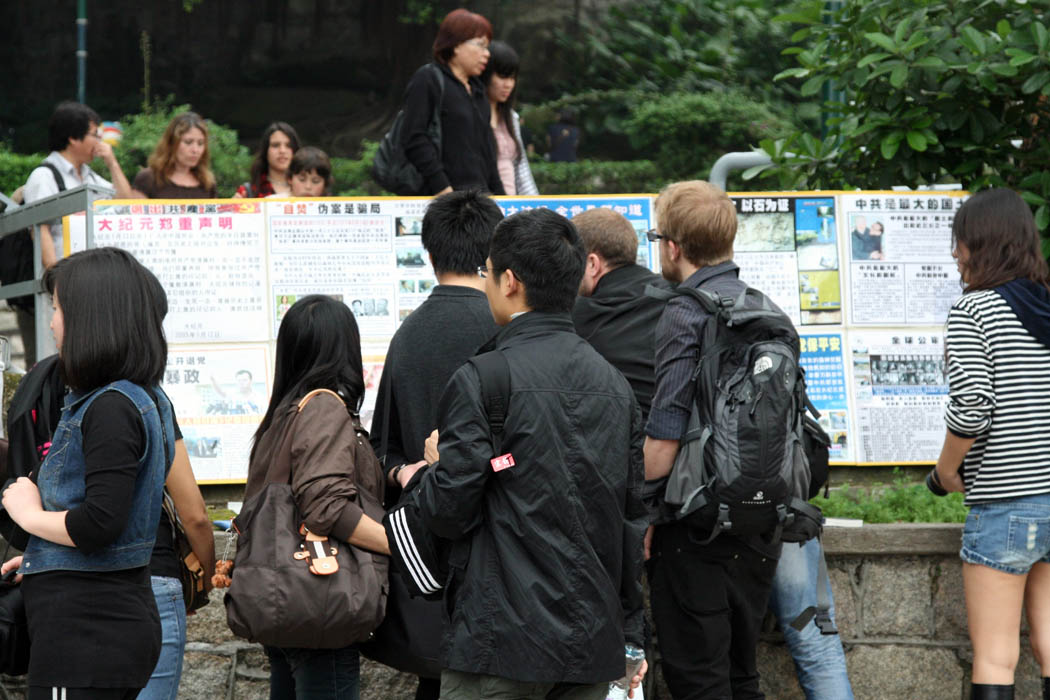 一天,大队游客过后,有位中年男子认真地在看“全球公审江泽民及因迫害法轮功被海外起诉的三十位高官”的图片。学员过去礼貌地与他打招呼:“您好!请问,你是党员吗?他点了点头。学员讲:“我给你取个化名,把党员退了,祝你有个美好的未来!”他欣然同意,说:“好!”随后他说:“你知道我是谁吗?我就是管你们(法轮功学员)的国安,请你快离开我。”学员为他选择退出中共感到欣慰,就走向别处去讲真相,稍后他就离开了。