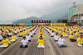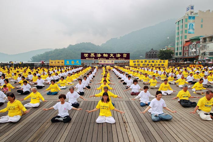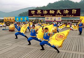 ![]() 千余名台湾中区法轮功学员五月八日集聚日月潭举行庆祝世界法轮大法日活动,图为学员炼第五套功法。 |
